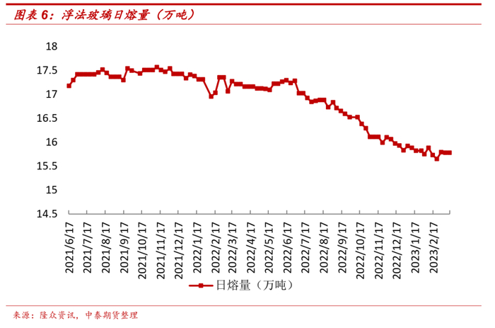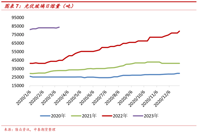 2023年纯碱开工率继续保持高位,重质碱周产量在32-34.5万吨之间,较2022年明显提高。需求端,截止到3月22日,浮法玻璃冷修6条产线,点火7条产线;光伏玻璃冷修4条产线,投产7条产线。其中3月份投产数量较多,随着产线陆续出产品,后续纯碱需求量将有所提升。从目前浮法以及光伏玻璃的日熔量来看,重质碱每周的刚需消耗在32.5万吨左右,加上出口的量,与产量处于一个紧平衡状态。