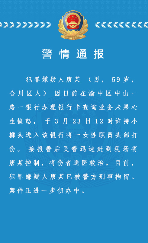 重庆警方:男子办银行卡查询业务未果持榔头打伤女职员,被刑拘。