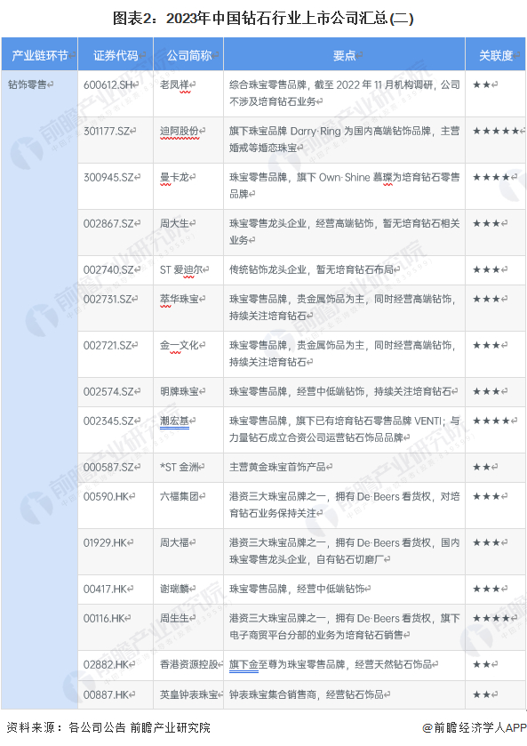 钻石行业是珠宝玉石行业中的重要分支,由于钻石自身的闪耀与美丽,是众多消费者以及珠宝设计师青睐的对象。在培育钻石广泛普及之前,我国钻石行业的主要参与者大多集中在下游零售环节,并且我国钻石行业中将钻石饰品这一单一品类的珠宝作为主营业务的上市公司较少,较为常见的是大型综合珠宝零售上市公司的业务板块中包含钻石类产品。培育钻石兴起后,我国钻石行业上游相对空缺的状态得以补全,下游也涌现一批以培育钻石为原材料的、主营产品为钻石饰品的上市公司。在培育钻石的带动下,我国钻石行业相关上市公司在产业链上下游均有分布。