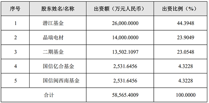 本次增资后,潜江基金、公司、大基金二期、国信亿合基金、国信闽西南基金分别持有湖北晶瑞44.3948%、23.9049%、23.0548%、4.3228%、4.3228%的股权。