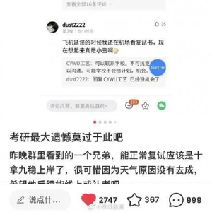 相关帖文下,还有一名广东本地考生分享自己今天准备去外地考研复试时,也遇到航班延误问题,但幸运的是该名考生最新回复中称飞机已顺利起飞,并未耽误次日的复试。