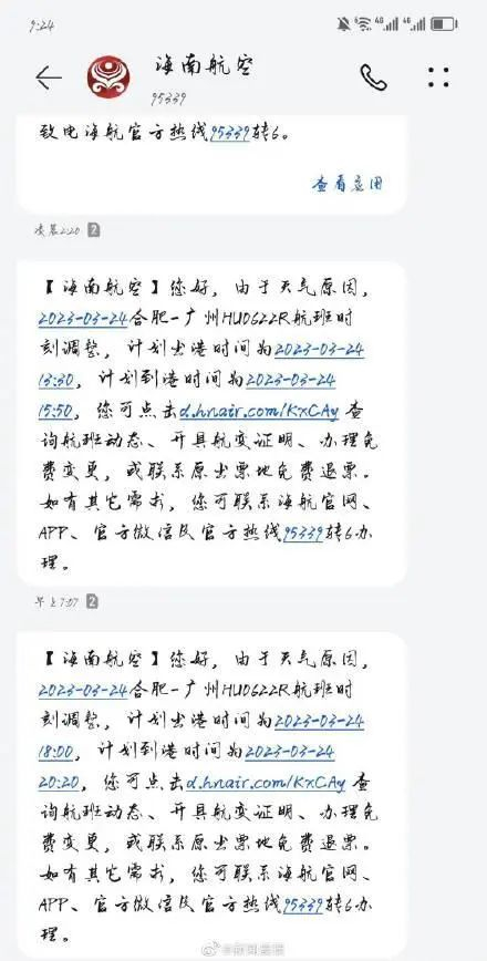 小刘提供给记者的机票及延误短信显示,其从合肥新桥机场出发至广州白云机场的航班,在23日被多次提示延误。“早上先是从9点延误到10点,后来又延误到下午3点,后来说是5点,最后一直陆陆续续延误到晚上12点后取消了。我当时也查过去广州的其他方式,但几乎所有方案都来不及。”