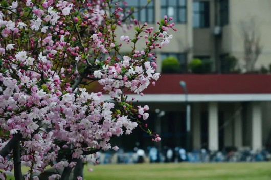 和煦春日,花开正好。上海财经大学的校园里满树樱花灿若云霞,垂丝海棠娇羞含蓄,繁花点点,绿草丛生,随风摇曳,沐浴春光。