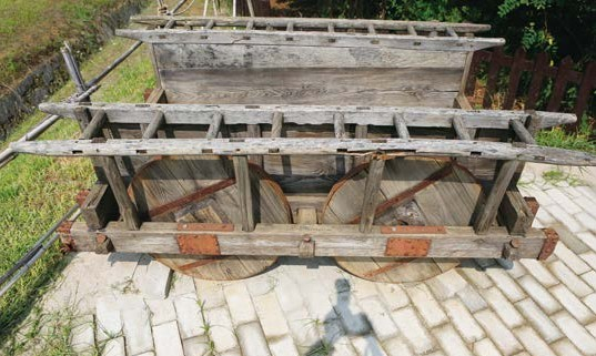 四轱辘车(拉拉车):近距离转运货物的工具。木制,有四个木轮,车厢由活动板围成。