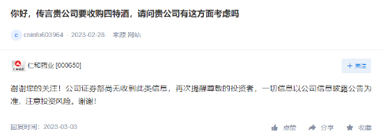 而就在3月初,市场也传出消息称,仁和药业要收购四特酒。针对这一消息,仁和药业3日在投资者互动平台上表示,公司证券部尚无收到此类信息,提醒投资者一切信息以公司信息披露公告为准,注意投资风险。