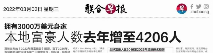 当下的新加坡,你知道有多少富人们?身家至少100万美元(约136万新元)的百万富翁共计52.6万人,占人口比例将近10%;净资产达到3000万美元以上(约4067万新元)的富豪人数达到4206人。