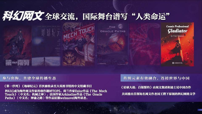 在输出海外方面,白皮书指出,一批经典的国产科幻网络文学亮相国际平台、传播中国故事,成为中国文化出海浪潮中的“弄潮儿”。2022年,以《地球纪元》《第一序列》为代表的一批中国科幻网络文学作品首次被收录至大英图书馆的中文馆藏书目,《超级神基因》《超神机械师》等科幻网络文学也先后入选由中国作家协会主办的2021、2020年度中国网络文学影响力榜“海外传播榜”,凭借上乘的创作质量与鲜明的审美个性在北美、东南亚等地区“圈粉”无数。