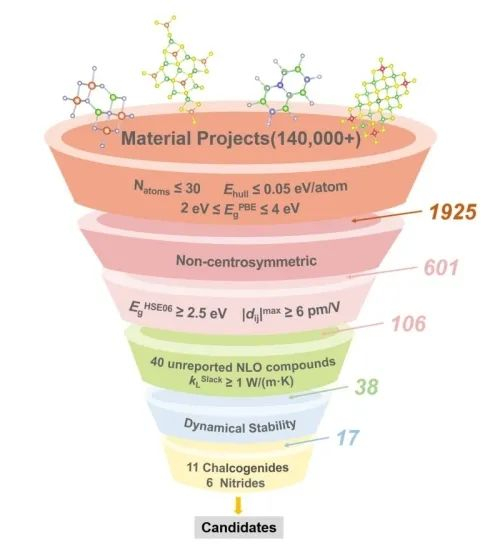 近日,中国科学院新疆理化技术研究所晶体材料研究中心报道了一种无偏高通量筛选方法,用于具有高热导率的非线性光学材料。该研究首次在非线性光学领域实现了热导率的高通量计算,并将热导率属性纳入非线性光学晶体的高通量筛选评估体系。研究通过高效、多级的高通量筛选方法,在数据库Material Project的140000多种材料中,筛选得到17种具有高热导率的非线性光学候选材料。它们均具有良好的光学性能:大的非线性光学响应(0.5-2.9×AgGaS2)、宽带隙(2.59-4.09 eV)。研究还对筛选得到的化合物Sr2SnS4进行实验合成,测试了其非线性光学响应,验证了筛选的有效性。详细的结构-性能分析揭示了氮化物与硫属化合物在非线性光学活性基元和热导率等方面的不同。该研究提出的高通量筛选方法为搜索具有高热导率的非线性光学材料提供了有力的工具。