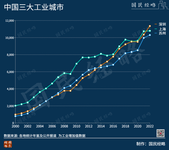 作为我国工业体量最大的三个城市,上海、深圳、苏州一直是你追我赶,上海长期作为领跑者,深圳苏州各有所长。