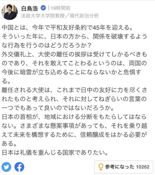 白鸟浩还称,“离任的大使为中日友好关系尽力了,应该对其工作予以犒劳。日本的首相不应该加剧地域隔阂,就算之间有一些尚待解决的问题,但为了解决这些问题畅想未来,有必要促进双方的信赖。希望日本能够保持注重礼仪的国家这一形象”。