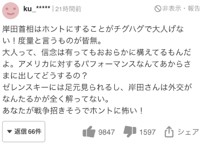 白鸟浩的意见受到日本网友的广泛赞同,有超过1万名网友认为这条评论“有帮助”。关于岸田文雄的这种做法,还有日本网友评论称,“岸田做的事情真的是让人不舒服,看起来很幼稚。完全没有风度。成年人,就算心里有想法也应该沉住气。像这种为了向美国展示的表演被曝光,到底在想什么?岸田还被泽连斯基小瞧,他真的是完全不知道外交到底是什么。你(岸田)可能会招致战争,真的让人害怕”。