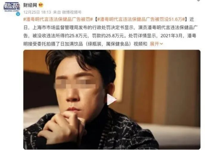 去年底,演员潘粤明因为一款保健品宣传而被处罚款50余万元。他的行为违反了我国《广告法》第18条规定,“保健食品广告不得含有下列内容:(五)利用广告代言人作推广、证明”。