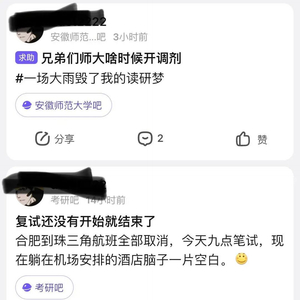 该考生介绍,自己在22日看到复试消息后,便购买了23日的飞机,但因为天气原因航班延误,他只好无奈在机场一边做复试准备,一边等起飞。直到夜里航班仍未能起飞,该考生意识到已无法及时赶往复试,便在网上分享了这一经历。不少学生表示,学校这样安排复试给到外地考生的准备时间太少,如果因为不可抗力导致缺考不能补考的话,对外地考生非常不公平。