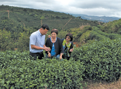 李志鸿(左一)与台商在茶园查看茶叶长势。