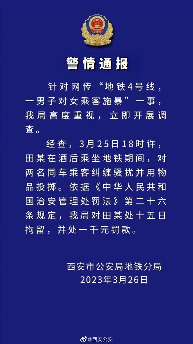 西安警方通报网传“地铁4号线一男子对女乘客施暴”一事