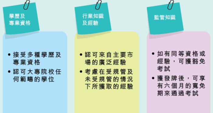 香港证监会表示,“我们承认在内地所取得的学历、执业资格、行业经验以及管理经验以满足发牌要求。”对于一些拥有足够经验的申请人,香港证监会会务实处理豁免其相关考试的规定,以获取牌照在香港执业,内地人员可灵活及有效地在网上提交牌照申请。