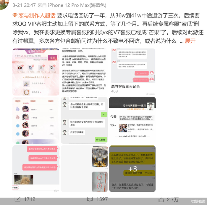 抽卡机制变更引发热议之际,部分玩家通过游戏客服反馈建议并寻求解决,据玩家奇迹如风介绍,为游戏充值41万元,游戏方因此安排了专属客服,但对方未能解决问题,自己反而被删除好友,目前也无法使用个人微博浏览游戏超话。此番事件的发生和持续讨论,再度为新机制上线引发质疑的叠纸游戏蒙上一层阴影。