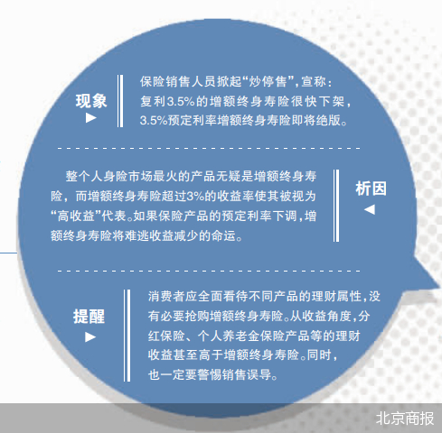 一波疯狂的“炒停售”正在保险销售人员的朋友圈刷屏。“就像4.025%的年金险一样,有效保额递增利率为3.5%的增额终身寿险也将成为历史绝唱”“复利3.5%的增额终身寿险很快下架,赶紧上车!”……
