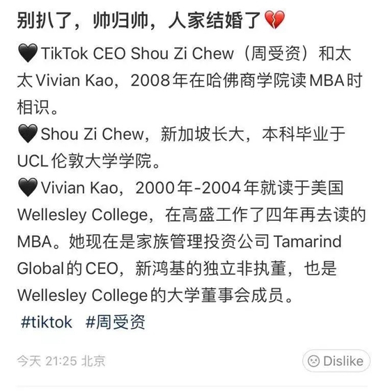 这两天因为TikTok听证会,CEO周受资备受关注,引爆热搜。至于听证会最终结果会如何,也是令人忐忑。也因此,他的太太也一下子几乎成为公众人物,看到到处都在转发下面这张图,都刷屏了。