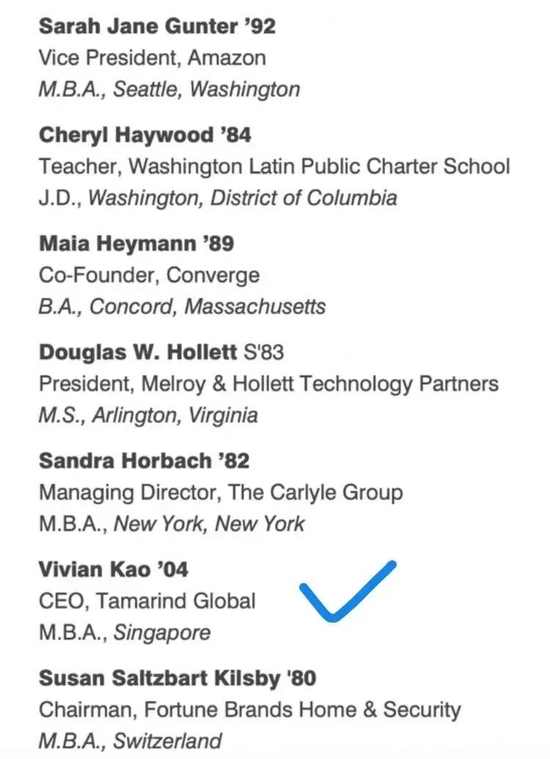 周受资本人就读哈佛商学院是依靠他所获得的奖学金,和他的名字也是神match,不过现在其他人又会成为他们捐款的受益者。Vivian还加入了哈佛商学院校友会的董事会。