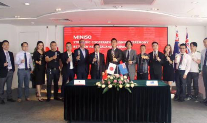 在跟各国加盟商签约时,名创优品摆出来的是日本国旗,而创始人叶国富及其它高管也曾参与合影。名创优品一心一意变成日本品牌的决心,可见一斑。