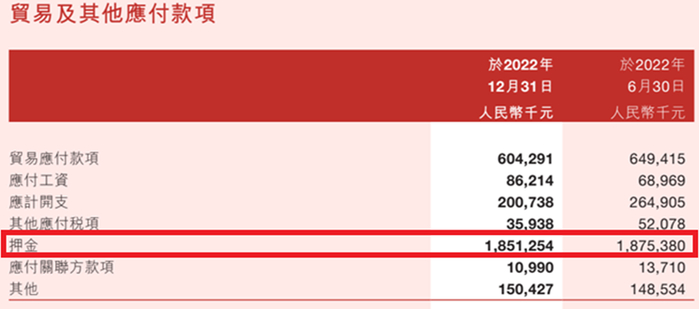 值得注意的是,名创优品还通过无偿占用加盟商和代理商的押金或保证金实现自身现金流顺畅流转。2019年至2022年财报年度,名创优品以押金方式无偿占用的加盟商和代理商的资金高达15亿-18.5亿元。