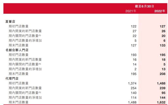 截至2022年6月末的财报年度,海外代理门店新开店239家,关店95家,关店率达40%;合伙人店新开18家,关店5家,关店率28%;直营店开店26家,关店20家,关店率高达77%.