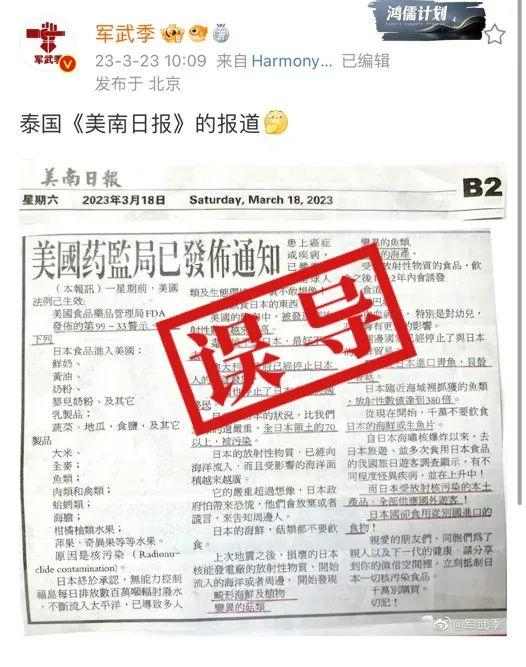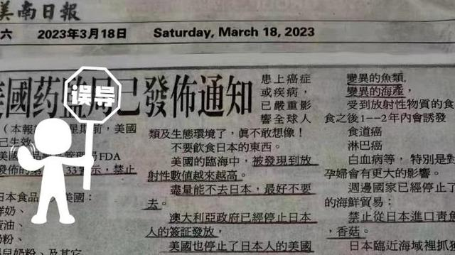 近日,社交平台流传一张图片,据称是泰国媒体美南日报2023年3月18日的一篇报道,报道中称,“美国食药监局发布的进口警示99-33于一周前生效,该警示宣布出于日本核污染的原因,禁止乳制品、蔬菜、肉类等多种日本食品进入美国。”图中还表示,“澳大利亚停止日本人的签证发放。”“美国停止日本人移民美国。”