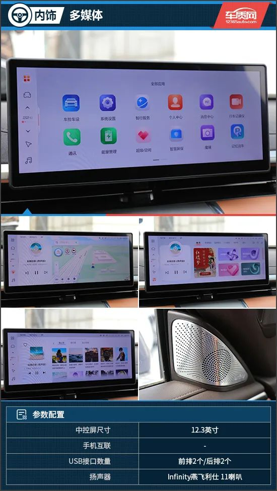 12.3英寸窄边框悬浮式中控屏显示效果清晰,内部操作系统在高通8155芯片的加持下整体操作非常流畅且反应灵敏。在功能方面,试驾车型选装了5G网络,在线听音乐、看视频时的网速自然没得说。与此同时,该车还配有燕飞利仕音响系统,车内视听享受得以保证。
