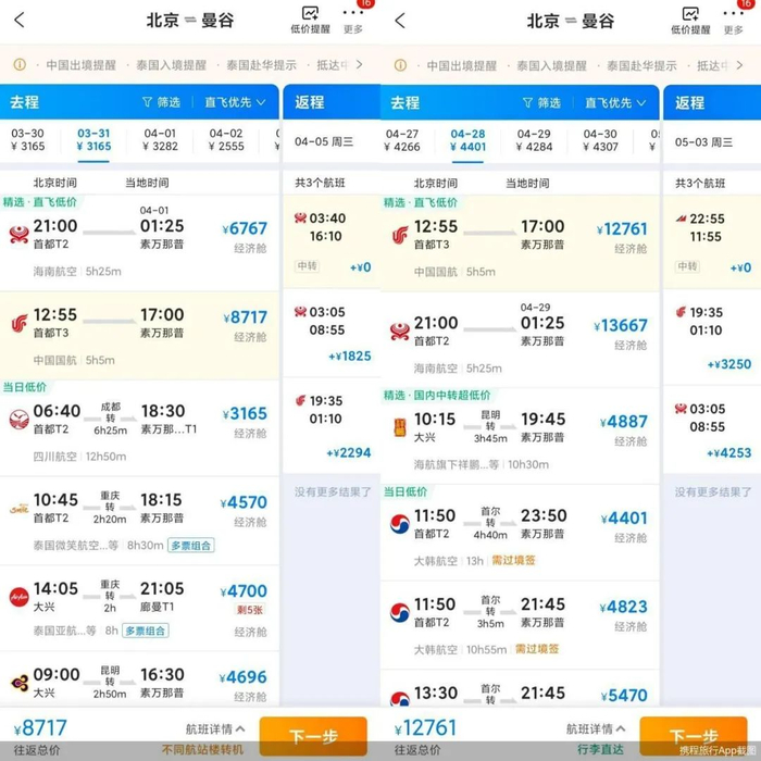 据携程旅行App,4月28日-5月3日,北京往返泰国曼谷的国航航班机票价格为12761元,与3月31日-4月5日(同为周五-周三)8717元的往返票价相比,涨幅近50%。酒店方面,曼谷W酒店4月28日(“五一”假期前一天)奇妙特大床房的房价为1792元/晚(含税/费),而同为周五的3月31日同房型的价格为1434元/晚(含税/费),涨幅为25%。由此可见,泰国机票以及部分热门酒店的价格也随着游客增多水涨船高。