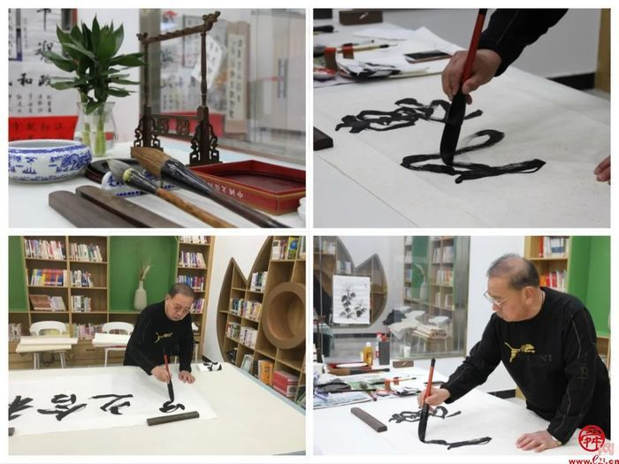一支笔,一沓纸,一方砚,一块墨,现场进行毛笔书法展示。本次活动邀请著名书法家刘福海先生现场进行毛笔字书法展示,聚精会神,慢慢运笔,用心书写,落笔纸上,一撇一捺展示汉字之美,一笔一画,点染人间繁花似锦,宣纸上随即出现一行行排列齐整却又极富个人书写特色的毛笔字,令人拍案叫绝。