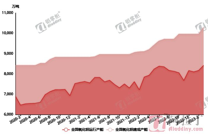 图1 2020年1月至今氧化铝建成及运行产能变化图