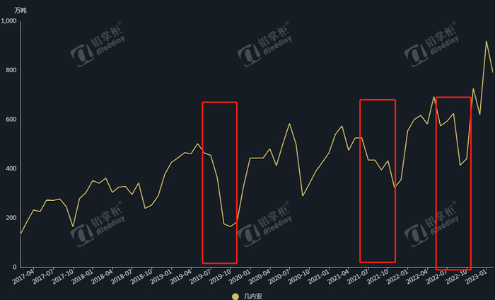 根据最新的海关数据,2023年前两个月,中国进口铝土矿2361.71万吨,其中1月份的铝土矿进口量达到了创纪录的1238.09万吨,进口几内亚铝土矿920.6万吨,同样是历史新高。2月进口几内亚铝土矿791.78万吨,为历史第二,这两个月创造历史的进口量似乎在证明一个观点,那就是在旱季时期的几内亚,具备运输、驳运和装载800万吨以上铝土矿的能力。