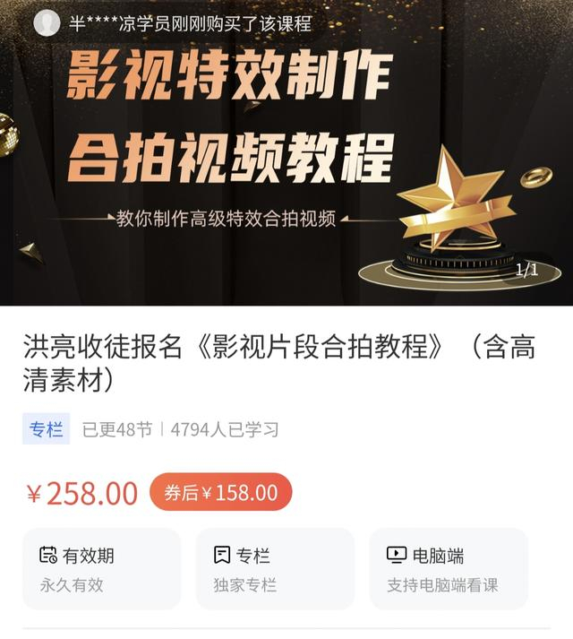 红星新闻记者注意到,“特效合成师洪亮”在抖音上已经有118万粉丝,收获了1285万赞。值得一提的是,“特效合成师洪亮”还在抖音卖影视特效制作的课程。根据其抖音中的链接可以看到,他的课程为158元,已经有4794人学习。