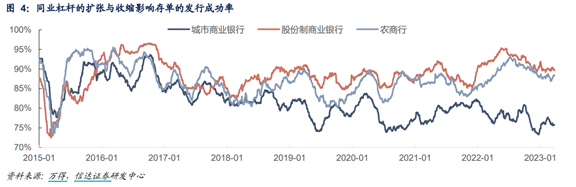 也正是因为存单利率对于同业杠杆的变化相对敏感,因此债券市场的投资者才会在特定的阶段对于存单利率的走势给予更大的重视。 当前资金利率已经回到了政策利率附近,央行在3月末的降准至少证明了货币政策短期尚未回到紧缩阶段,1-2 月信贷投放规模的上升也存在着短期冲量的因素。22Q4 货币政策执行报告对于推动信贷大幅扩张的诉求有所下降,后续商业银行的负债压力可能也会相对有限,同业杠杆后续大概率将重新回到平稳的阶段。