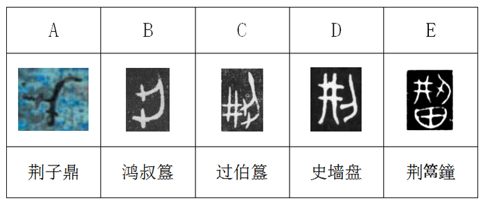 甲骨文中暂未见到“荆”字。最早的荆,始见于西周金文,大致有5种不同写法。如下所示: