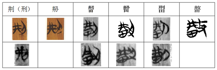 ”,与周金文相同,而后字形均带“田”。字形差异主要是从刀还是从刃的区别,极个别把义符“刀(刃)”换作“攴”,这是因为在古文字当中,刀、刃互通,“攴”的本义是指手拿棍棒、皮鞭类抽打,组字时,拿刀与执棒等方式均与手上动作有关,故刀(刃)、攴在字中作义符时可互换。从攴还有一种可能,即指手持荆条抽打。