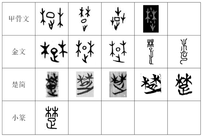 为便于阐述,我们先把“楚”的古文字字形列举如下:
