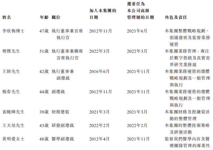高管包括首席执行官李欣梅博士、联席首席执行官樊杰先生、副总裁王帅先生这3名执行董事,以及副总裁杨春先生、财务总监袁晓晖先生、研发副总裁王天培先生、医学副总裁黄明爱女士。