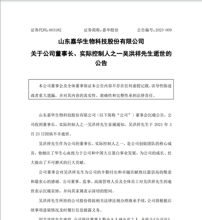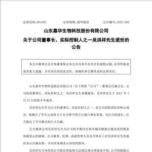 3月26日晚间,嘉华股份(SH603182)公告称,公司董事会沉痛公告,公司收到董事长、实际控制人之一吴洪祥家属通知,吴洪祥于2023年3月23日因病不幸逝世,年仅56岁。