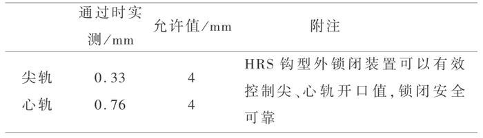 结果分析:脱轨系数为 0.05 ~0.22,减载率为 0.13 ~0.4,轮轴横向力为 2.9 ~19.6 kN,横向水平力为 3.1 ~15.4 kN,均小于安全限值,安全性满足技术要求。尖轨薄弱断面轨底应力如表 7 所示,钢轨和翼轨轨头动态横向位移如表 8 所示,尖轨和心轨开口量如表 9 所示,相关量值均小于对应安全限值,满足安全性要求。