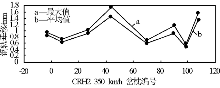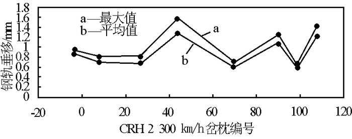 图 24 钢轨垂向位移平均值和最大值(CRH2 -300 型动车组,350 km/h)
