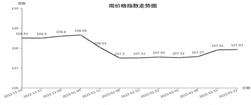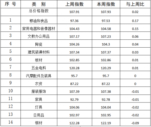 中国发展网  据临沂商城价格指数信息系统监测,本周临沂商城周价格总指数为107.93点,环比上涨0.02点,涨幅0.02%。