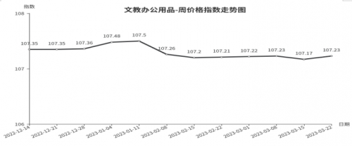 本周,文教办公用品类周价格指数收于107.23点,环比上涨0.06点,体育娱乐用品类和文化办公用品类价格均出现上涨的情况,分别上涨0.07点和0.04点,是拉动文教办公用品类周价格指数上涨的主要原因。