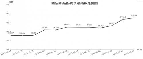 本周,粮油和食品类周价格指数收于97.53点,环比上涨0.17点,从盘面看,粮油类和调味品类分别上涨0.22、0.02点,是拉动粮油和食品类周价格指数上涨的主要因素。