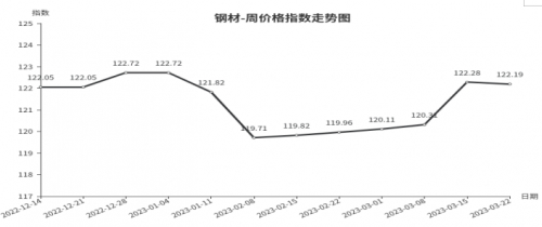 本周,钢材类周价格指数收于122.19点,环比下跌0.09点,跌幅0.07%。从盘面看,三级分类中全部下跌,其中型材类跌幅最大,指数环比下跌0.64点,成拉动指数下跌主力,板材类、管材类、建筑钢材类指数分别下跌0.20点、0.11点和0.07点。
