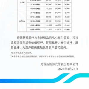 3月27日,奇瑞新能源宣布,受惠于全球新能源原材料价格回调,以及企业成本管控、供应链管理能力提升,奇瑞新能源将于2023年3月27日零点起正式调整旗下车型官方指导价,至高回调幅度9000元。