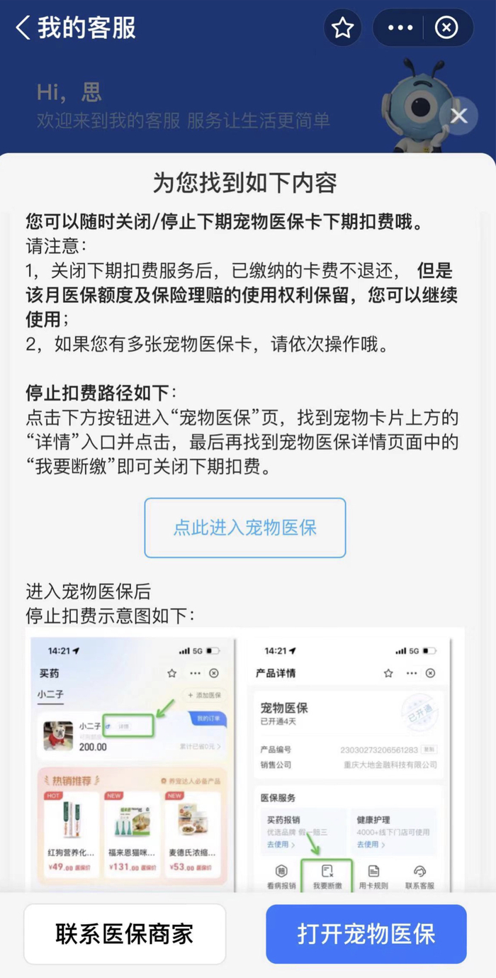 难道真像琪琪所说,必须得找客服投诉才能关闭自动续费吗?记者在App中反复尝试,总算发现了退订渠道:进入支付宝“蚂蚁宠物”小程序后,右上角的智能客服里有一则取消续费的操作指南,记者按照指南进行尝试:进入自己的宠物医保小程序后,先点击宠物报销金下方的“查看详情”进入买药报销的页面,这时,宠物旁边会出现“详情”两个小字,点击进入后,正中间有一个取消缴费的按钮,点击后还会再弹出“是否确认取消”的页面。算下来,记者打开了5个页面方才成功取消了自动缴费,显然与工信部要求的“互联网应用要在服务期间提供便捷的随时退订方式和自动续订、自动续费取消途径”相距甚远。