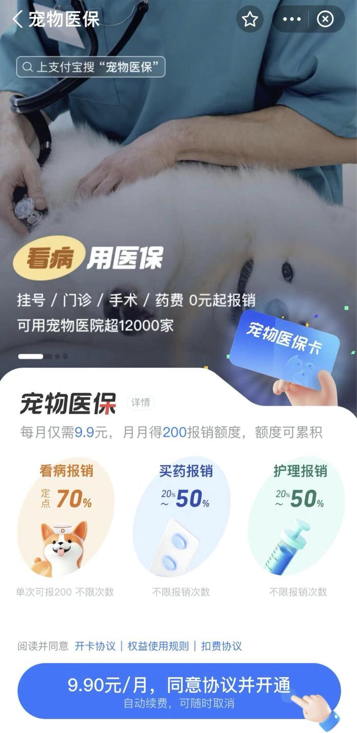 近来,在社交平台和黑猫投诉网站上,类似的投诉层出不穷。不少消费者都直言被莫名扣款后查询不到相关记录,自己更是无法主动关闭自动续费功能。由于福卡活动已关闭,记者并未在支付宝App上找到所谓的免费医保卡,但这款宠物医疗保险依然存在:底部一行小字提醒,9.9元连续包月即可享用200元的宠物医疗保障,还可随时取消。记者尝试开通该服务时,小程序并未要求先输入宠物信息,付款后,也跟众多消费者一样,在支付设置中的“自动扣款”一栏并未看到该款服务的具体条目,更谈不上退订。