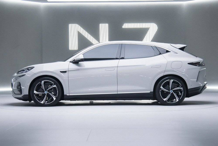 从侧面来看,N7的猎跑造型放在SUV市场里还是更显轻盈的。车身侧面没有更多复杂的曲线设计,仅有一条略微上扬的腰线作为车身姿态的指引。而水切线的走向,在到达C柱后开始有明显的上扬,最终在车辆中后部构成了伶俐的三角窗。